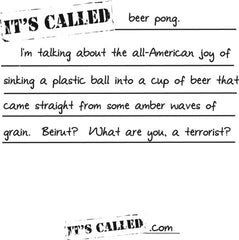 “It’s Called beer pong. I’m talking about the all-American joy of sinking a plastic ball into a cup of beer that came straight from some amber waves of grain. Beirut? What are you a terrorist?”